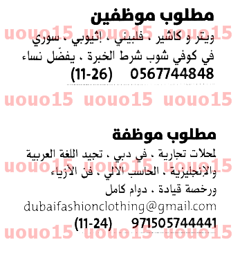 مطلوب موظفة للعمل في محلات تجارية في دبي.