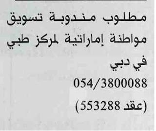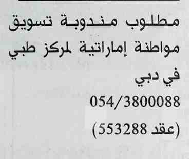 مطلوب مندوبة تسويق لمركز طبي في دبي.