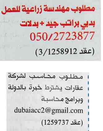 مطلوب مهندسة زراعية للعمل في الامارات.