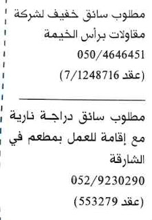 مطلوب سائق للعمل في شركة مقاولات في راس الخيمة.