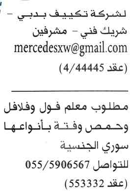 مطلوب معلم فول وفلافل سوري الجنسية.