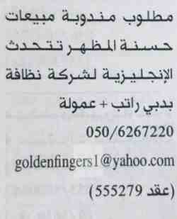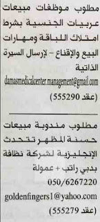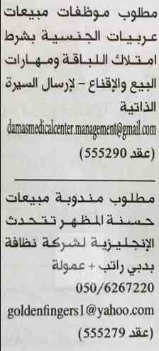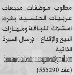 مطلوب موظفات مبيعات عربيات الجنسية.