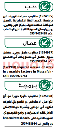 مطلوب عامل سوري للعمل في مصنع رخام بالمصفح.