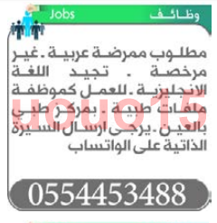 مطلوب ممرضة عربية تجيد اللغة الانجليزية للعمل في مركز طبي.