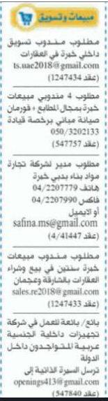 وظائف شاغرة مبيعات وتسويق في الامارات من جريدة الخليج اليوم 20 يناير 2018.