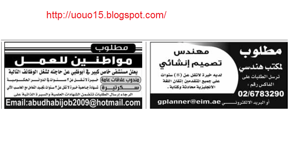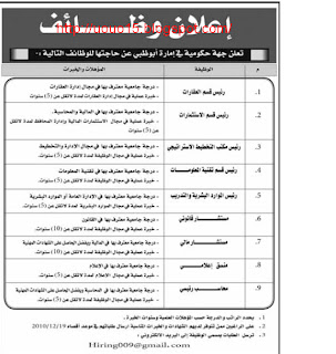 أكمل المقالمطلوب سكرتيرة ومديرة مكتب.حسنة المظهر .لبقة .تجيد التعامل مع العملاء.للعمل بمكتب في ابوظبي يرجى ارسال السيرة مع صورة شخصية الى jobsauh2010@gmailcom