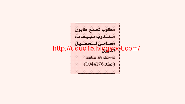 والاعلان المنشور على مسؤولية المعلن فقط. ولذلك ننبه زائري المدونة عدم دفع أي مبالغ مالية للمعلن قبل التأكد من أنه حائز على التراخيص القانونية المعتمدة في الدولة.