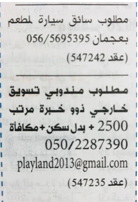 مطلوب موظفين وموظفات للعمل في الامارات بالوظائف التالية:
