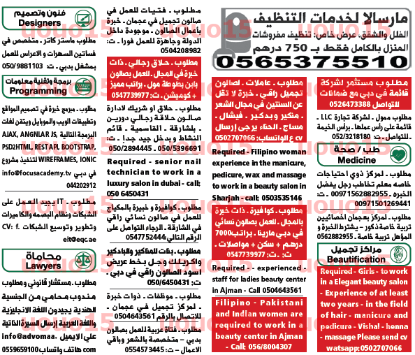 مطلوب موظفات للعمل في مركز تجميل في عجمان.