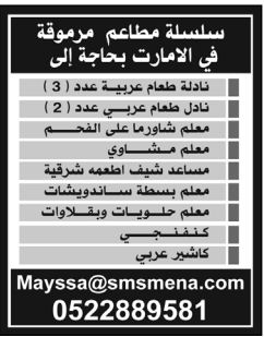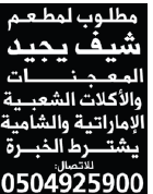 مطلوب طباخ مندي ومظبي للعمل في العين.
