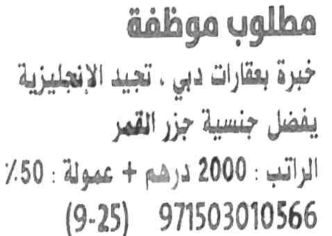 مطلوب موظفة خبرة بعقارات دبي.