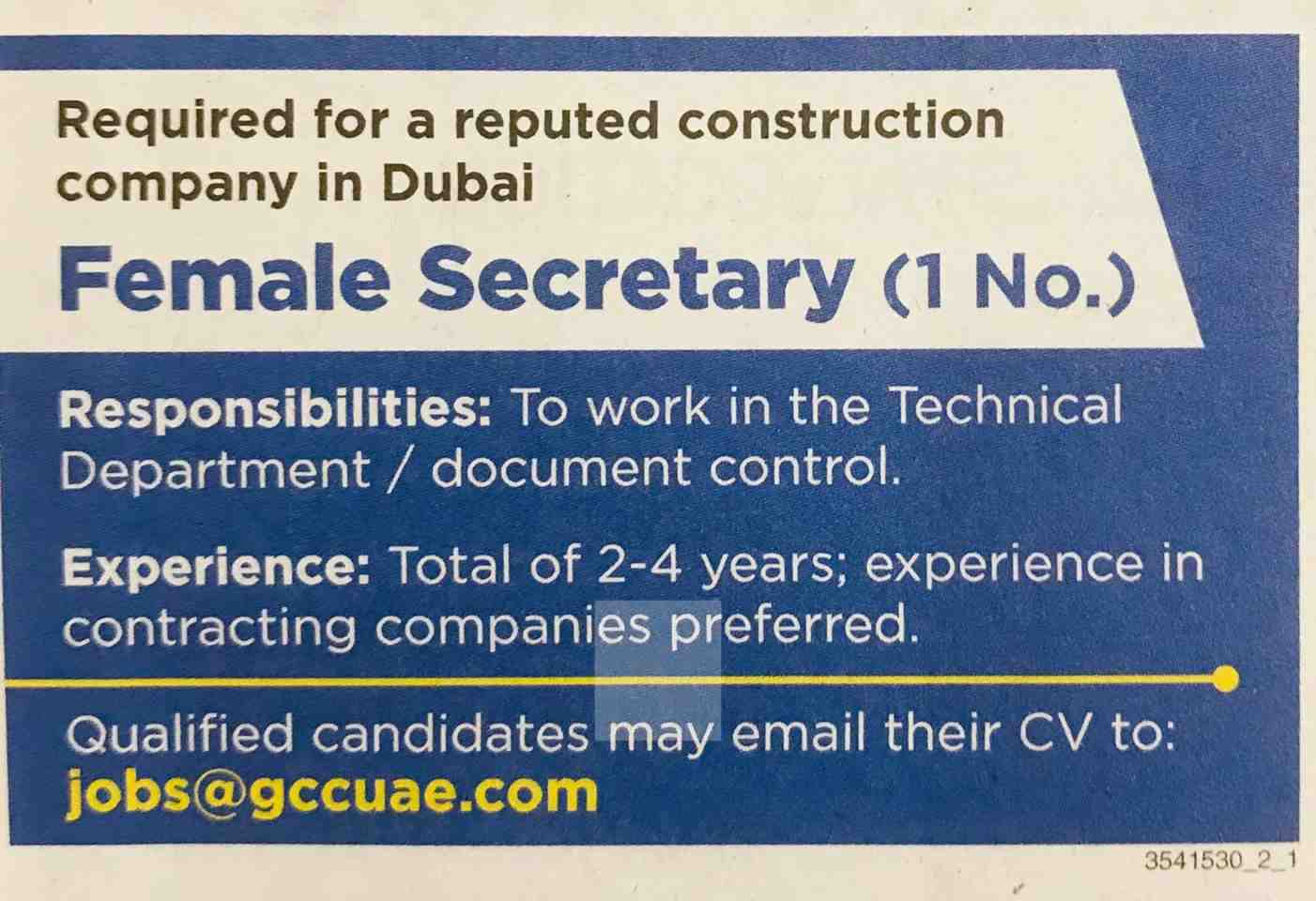 مطلوب سكرتارية للعمل في شركة كبرى في دبي.