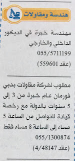 تعلن عن حاجتها الى:
