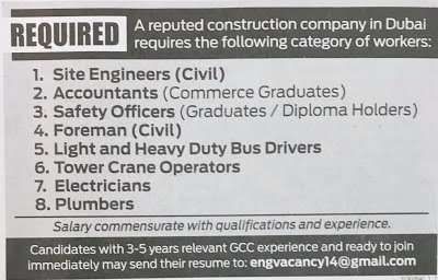 مطلوب سباكين وفني تكييف وبنائين وحدادين للعمل في الامارات.