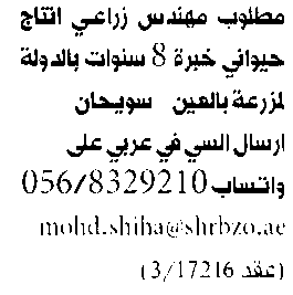 مطلوب مهندس زراعي لمزرعة في العين.