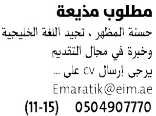 مطلوب مذيعة حسنة المظهر تجيد اللغة الخليجية.