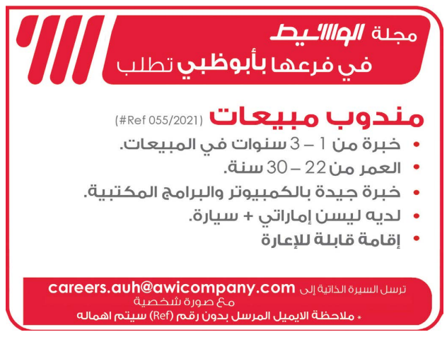 مندوبين مبيعات لكافة الامارات.