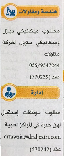 مطلوب ميكانيكي ديزل وميكانيكي بترول لشركة مقاولات.
