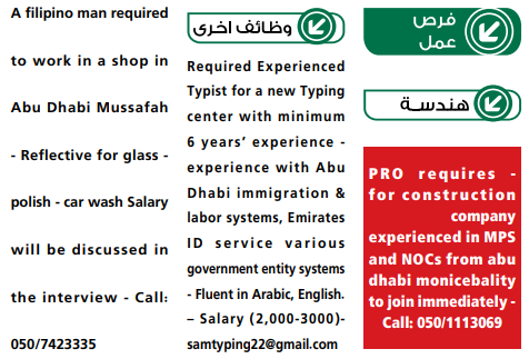 مطلوب مندوب عربي يجيد اللغة الانجليزية والكمبيوتر للعمل في ابوظبي.