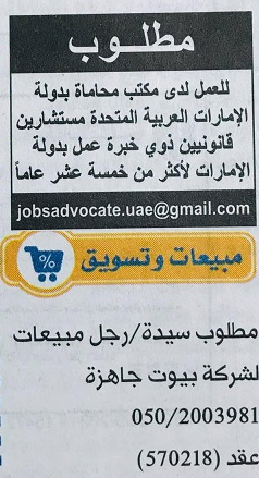 مطلوب للعمل لدى مكتب محاماة بدولة الامارات العربية المتحدة: